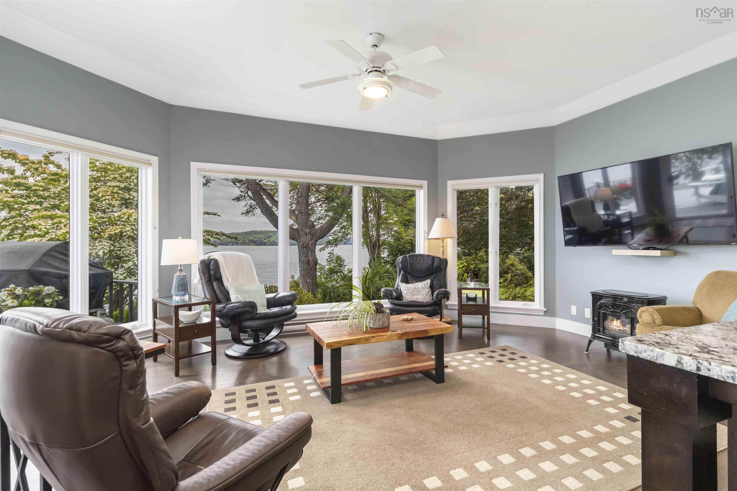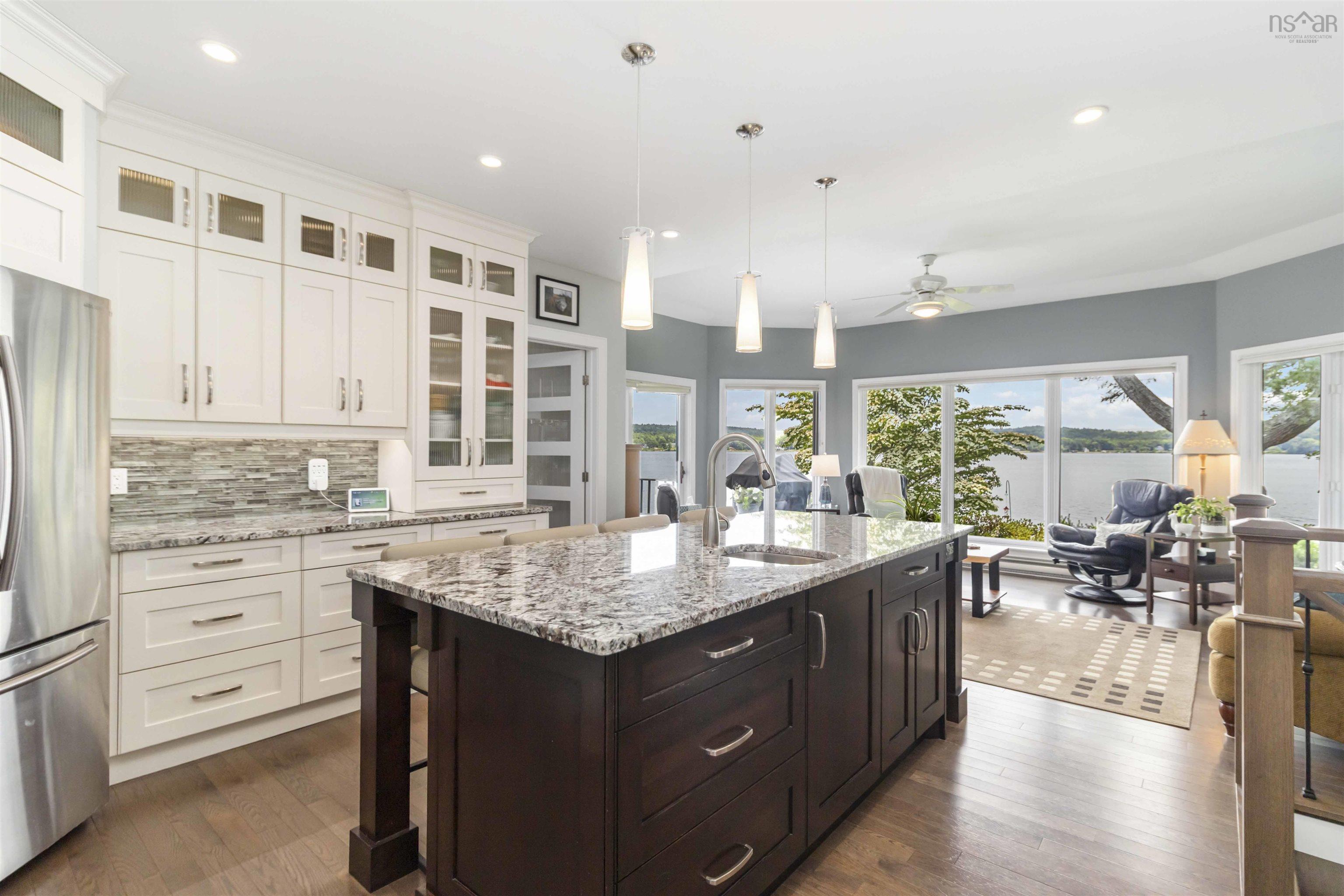 This is LaHave Riverfront like you’ve never seen it before. With jaw-dropping 180-degree river views, a private beach, paved ramp and boat launch, dock, deep water for your boat, and that golden, level frontage everyone wants but few ever find, this is waterfront living redefined. Impeccably maintained and undeniably rare, this property delivers on every level. Step inside to over 2,600 sq. ft. of sprawling main-level living, where every space is as thoughtful as it is beautiful. The heart of the home is a gorgeous, custom kitchen—perfectly designed for entertaining or quiet morning coffees with a view overlooking the water. The flow is open and effortless, with two stone fireplaces and expansive windows that bring the outside in with every season. With 3 bedrooms and 2 full & 2 half baths, plus a main-floor den and dedicated office, there’s space to live, work, and unwind without compromise. Downstairs, a massive lower-level rec room offers the ultimate flex space—perfect for games, movie nights, or multigenerational living. The home is equipped with ducted heating and air conditioning, Cummings Direct Transfer Generator, a durable metal roof, and paved driveway that leads to not one, but two garages: a detached double garage and an additional single garage, which the sellers affectionately refer to as the Boathouse. There is even a massive workshop in the basement. Outside, professionally landscaped grounds blend seamlessly with the natural setting, anchored by a retaining wall that adds both structure and style to the waterfront edge. Every inch of this property has been loved and maintained with care—from the manicured lawn to the gleaming interiors, and most of all, to the unforgettable lifestyle that surrounds it. Modern, majestic, and made for living. This LaHave River property is a masterclass in elegance, comfort, and one-of-a-kind coastal living.