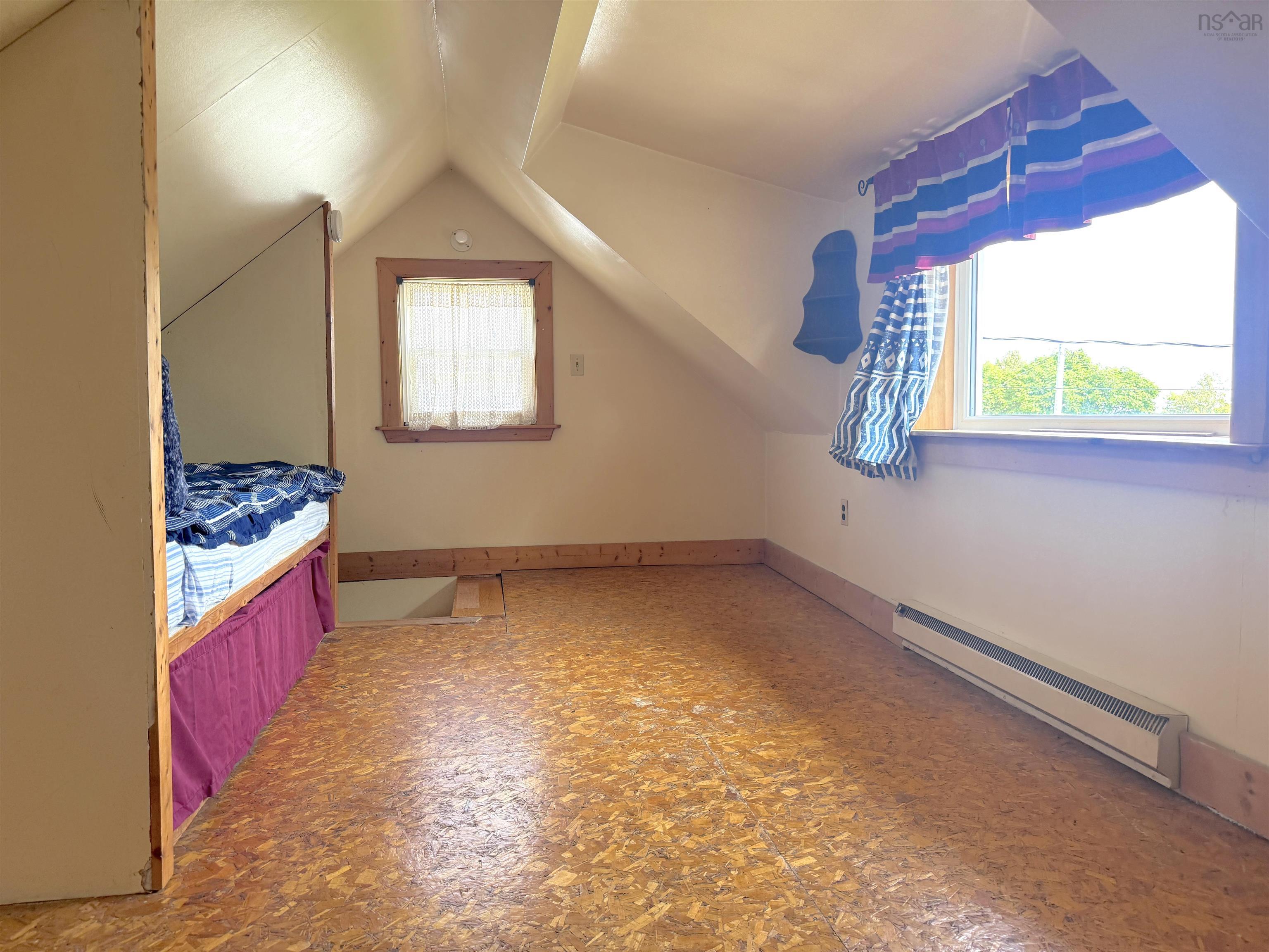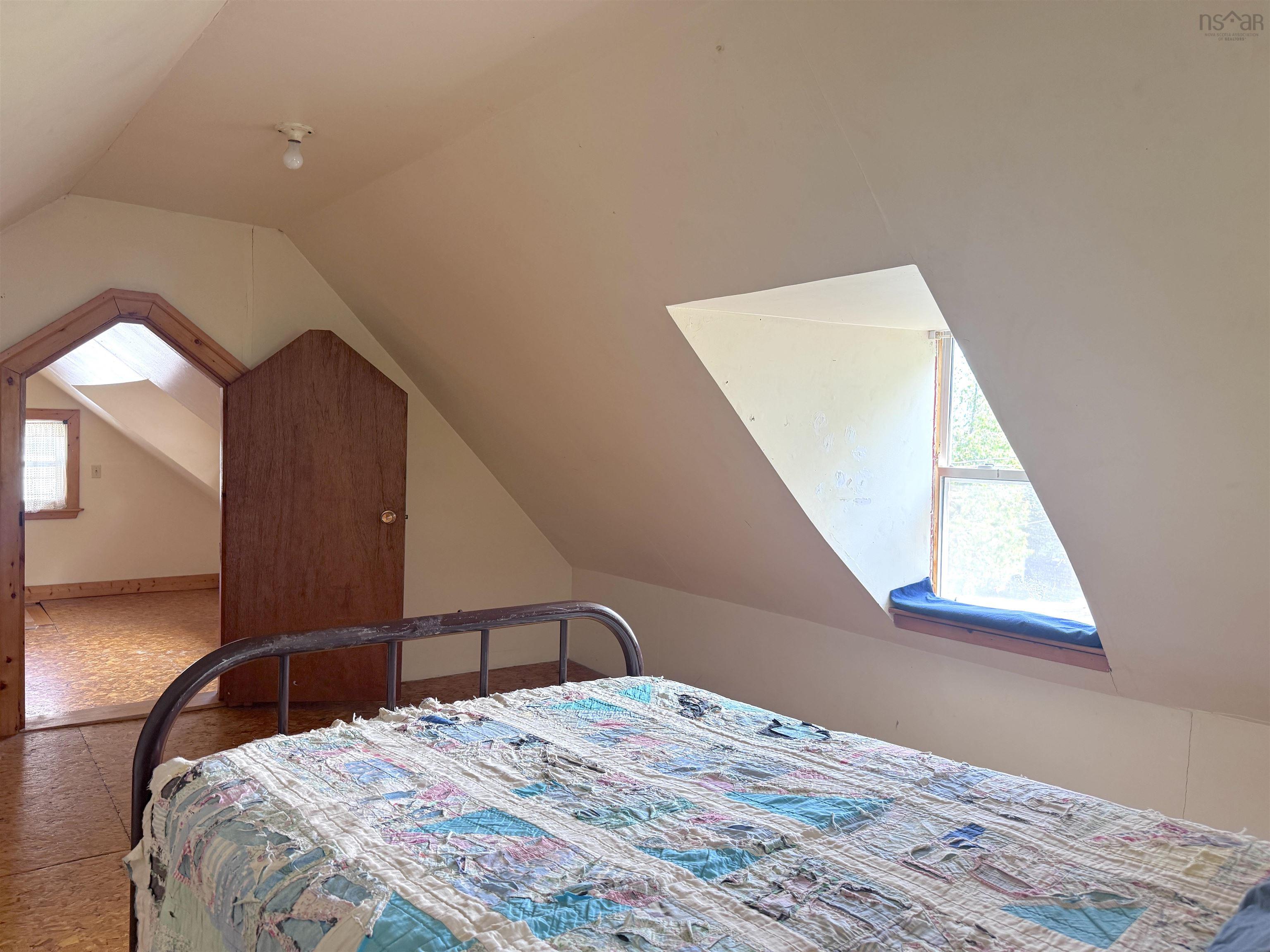 Located on a quite residential street, in the Village of Baddeck, this charming older home is seeking a new resident to call it their own! Sitting back from the road and situated on a large village lot, the home provides an affordable space with opportunity to invest and renovate. While in need of shingles on the roof, there are newer vinyl windows throughout and a spacious open layout on the main level. Entering in to the front foyer, light is dispersed to create a welcoming sun room and entrance. From here, enter the living room, with open space focused around the corner wood stove. Heated primarily by electric baseboards, the heat pump provides efficient heating and cooling in this open space for the entire home. The kitchen and dining area is spacious with stairs from here to the upper level. Upstairs you will find one or two bedrooms, however you wish to design them. Maybe one large walk-through sitting area off of the bedroom or an area for a single or double bed as you walk through to the main bedroom area. Outside of the home is a large storage shed at the back, private space in the backyard and a front sitting area on the deck, with ramp access. Water views can be realized from this property!! Being situated on one of the higher streets in the Village. This home and property is ideal for someone who is looking for an investment in the Village. Ready for possession in late October, you can be in before winter & cozied up to the wood stove for Christmas.