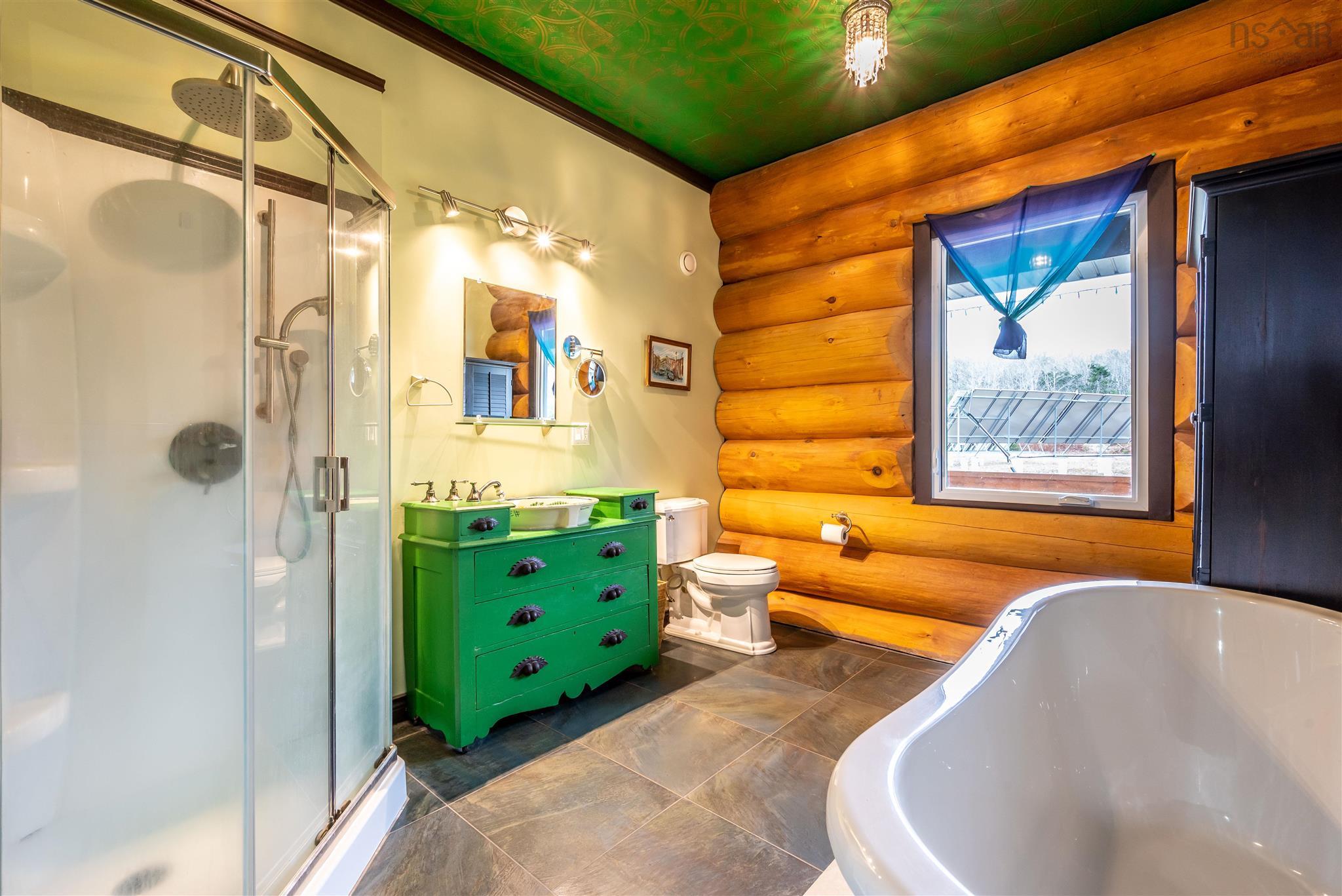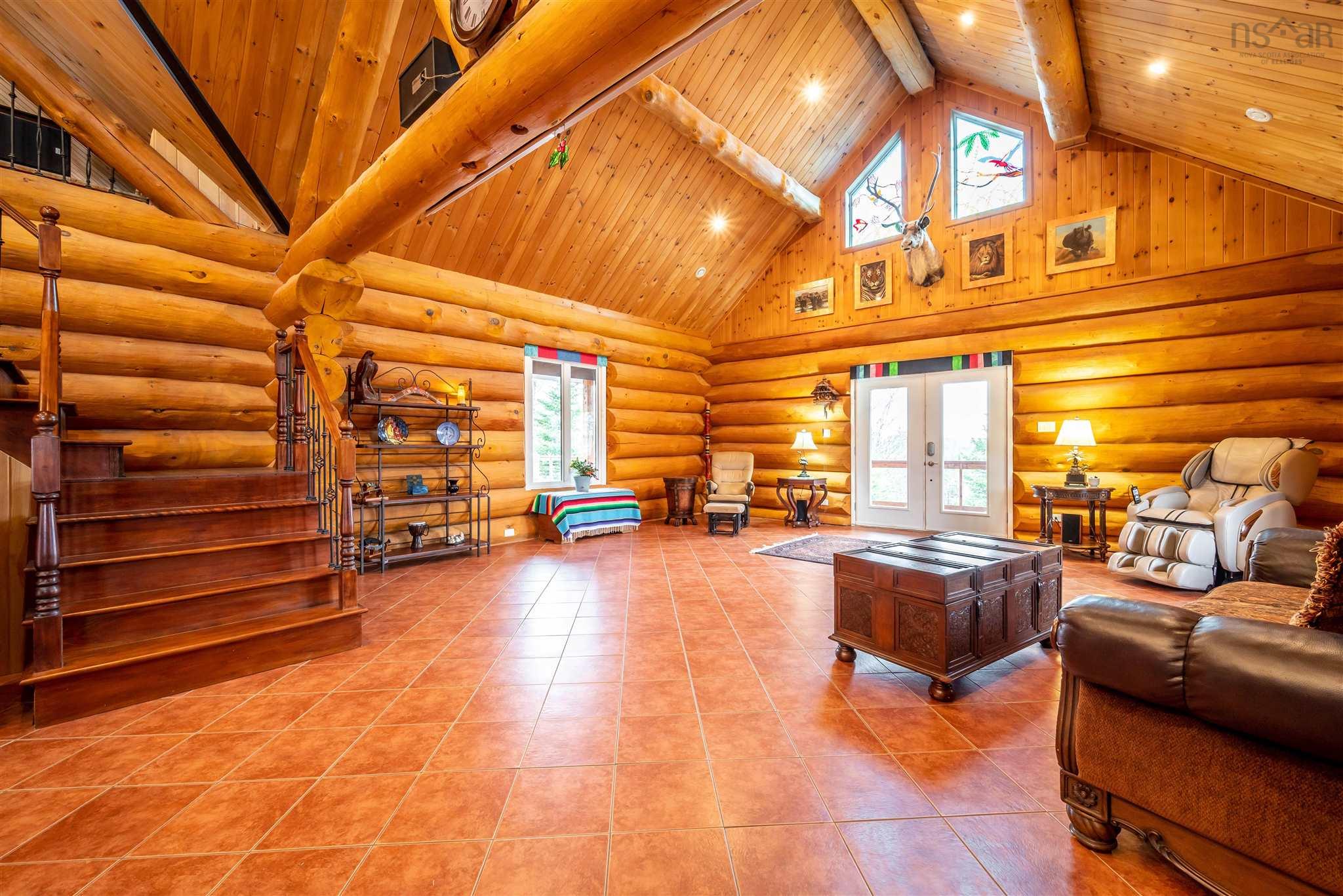 Once in a lifetime opportunity in beautiful Nova Scotia. This majestic 2470 sq ft custom pine log home with an 1800 sq ft partially finished walk-out basement is set on 25 acres of mixed trees and offers 1375 feet of pristine lakefront. The main level features ceramic floors throughout, a stunning open concept kitchen, dining and living area with 22 ft cathedral ceilings, and beautiful lake views. The spacious, sound-proofed primary suite includes a luxurious ensuite, walk-in closet, and a private balcony with direct access to the hot tub. The main level also includes a laundry room with a half bath. The loft provides a bright open space perfect for an office, studio, gym or can be converted into two additional bedrooms if needed.Built with large 40 cm logs, the home exceeds R2000 energy standards and includes energy-efficient appliances, vinyl windows and 6 ft double garden doors. The property features a wide, low-maintenance wrap-around composite deck and accessibility touches including wider doorways. A 14.5 KW solar system with Net Metering, hot water collectors, and an air-to-water heat pump provide in-floor radiant heat and summer cooling, while the commercial-grade diesel generator, battery bank, and oil-fired water boiler ensure reliable backup power.A fully insulated 2400 sq ft workshop with in-floor heat, its own water supply and septic, and commercial use approval offers endless possibilities for business or hobby use. A new 10 x 33 greenhouse with modern amenities is also included. Enjoy ATV and snowmobile trails throughout the property, and a peaceful lakefront area ideal for swimming, boating, fishing, or relaxing. The lake offers approximately 7 meters of depth with a gradual shoreline. Located just 20 minutes from hospital and essential amenities, 35 minutes to Taylor Head Provincial Park’s sandy beaches, and under 2 hours to Dartmouth, Halifax and the Halifax Stanfield International Airport. Full list of inclusions, upgrades and luxury finishes!