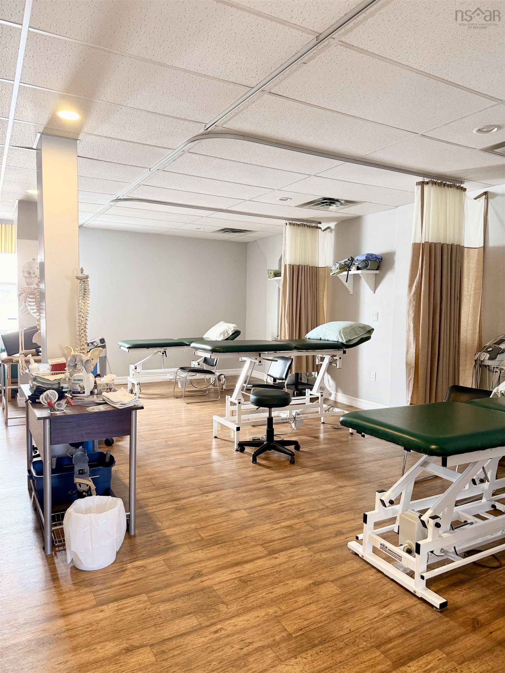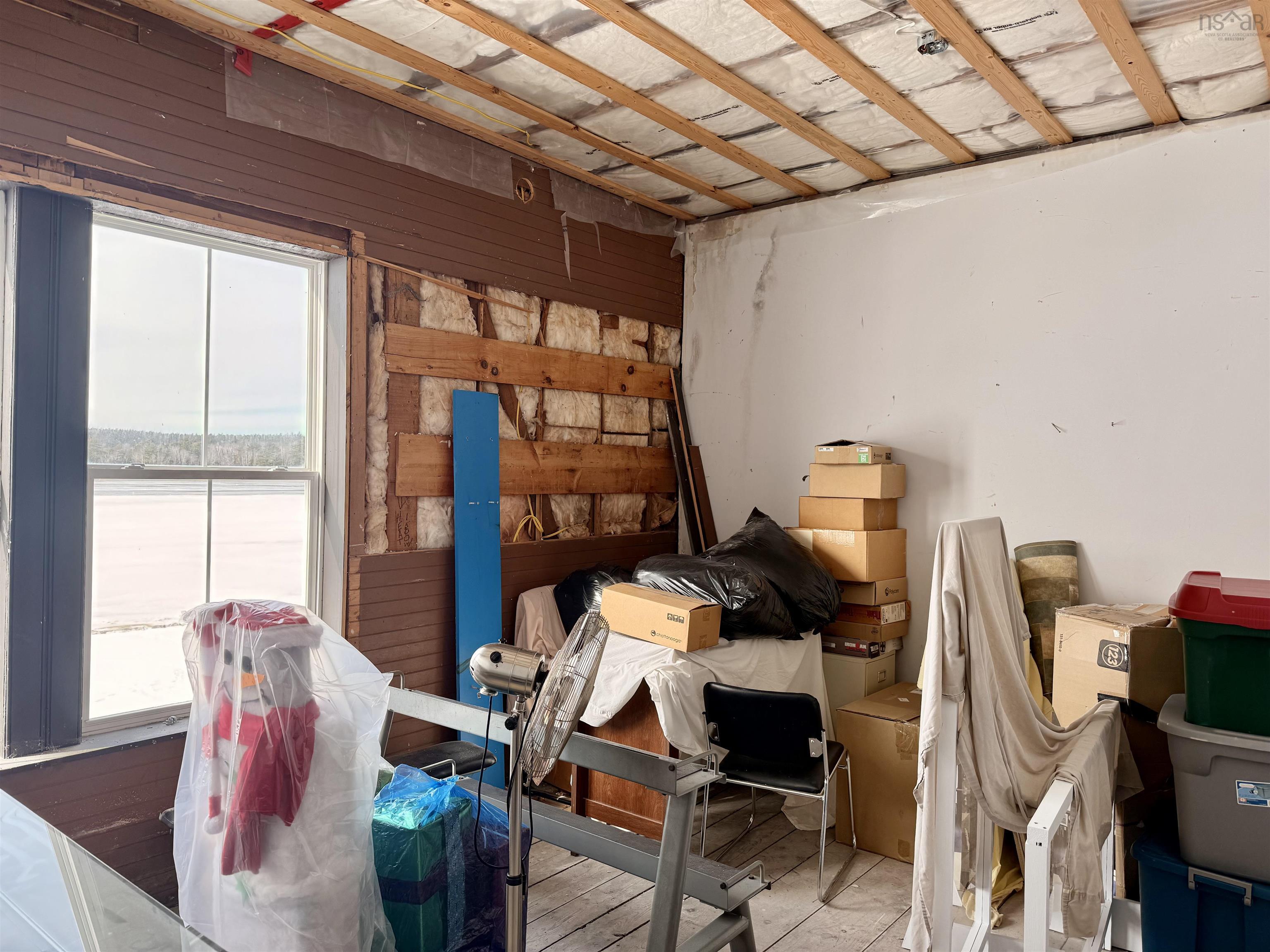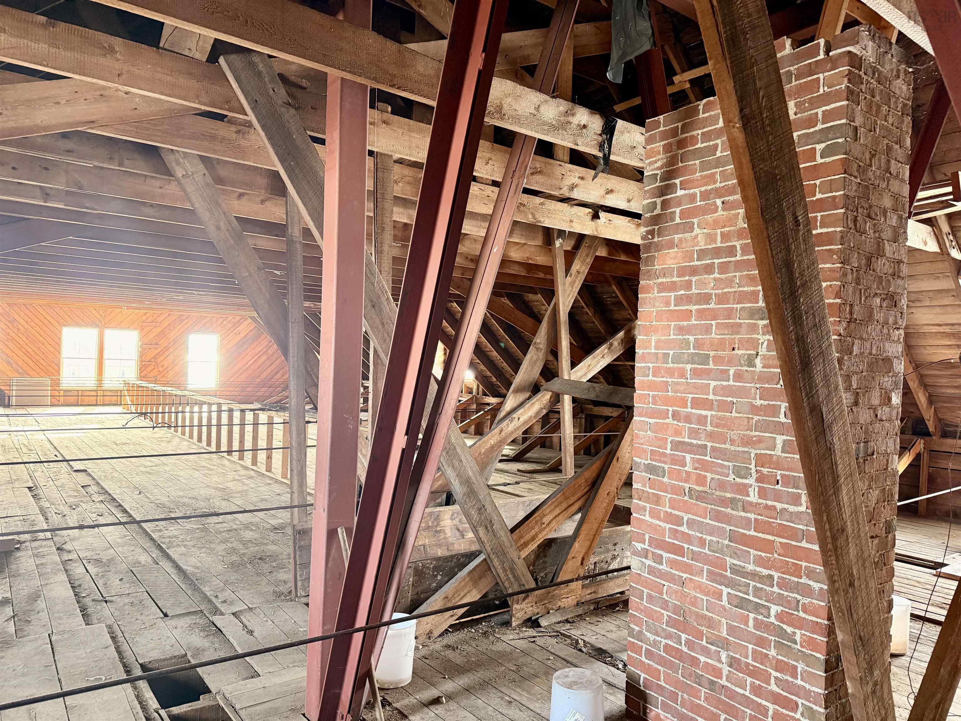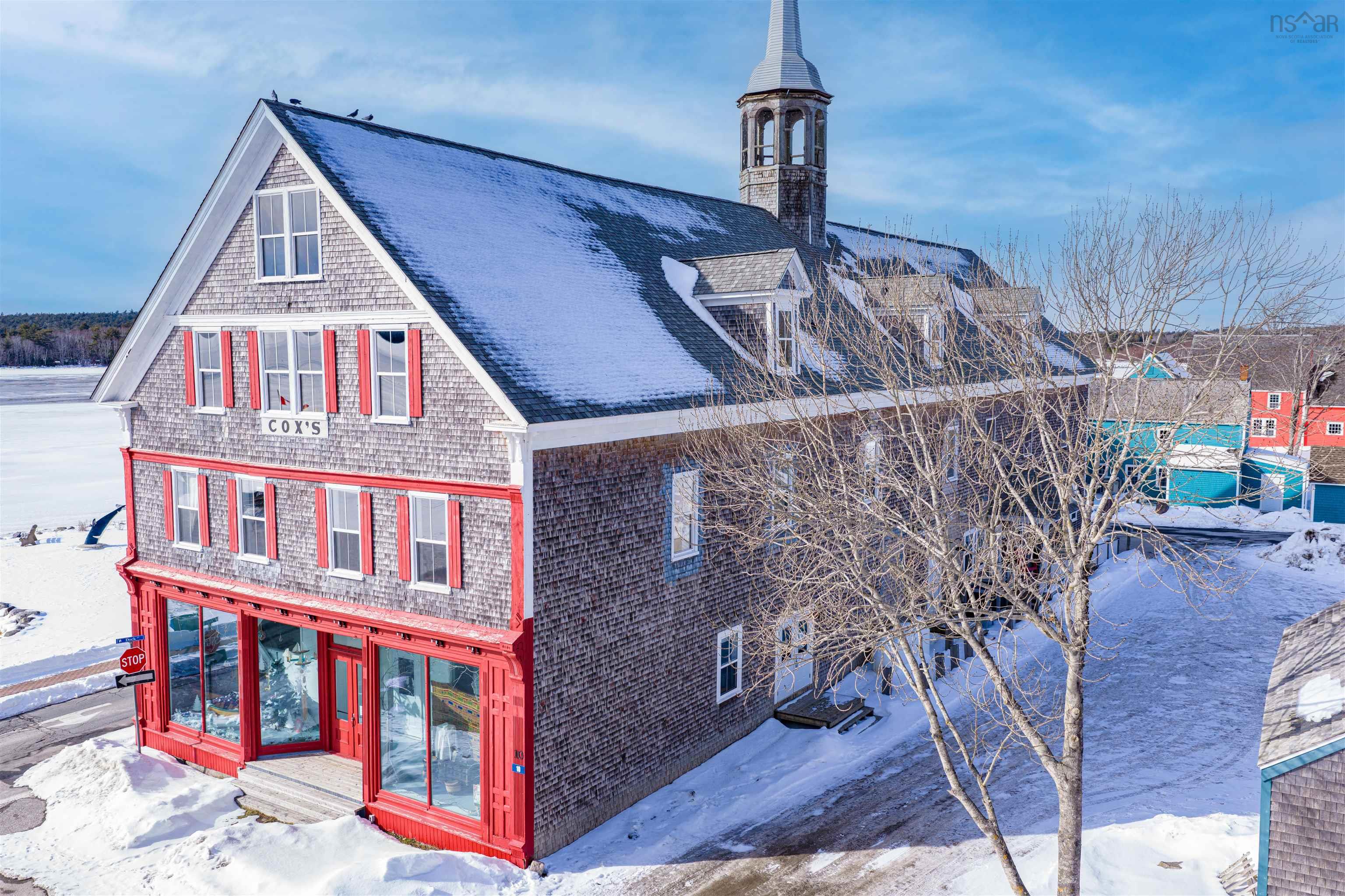 An iconic landmark on the waterfront of Shelburne’s historic district, this large Greek Revival building is set directly on Dock St., facing south and spanning the length of the block from Ann Street to Maiden Lane. Known locally as the Cox Warehouse, it was built for merchant and shipbuilder George A. Cox in 1902 and acquired by the Shelburne Historical Society in 1986. The building, which is a municipally registered heritage property, is 160 ft / 49 m long, has three storeys and sits on a granite block foundation. The structure’s exterior still boasts many of its original architectural features, including return eaves with ornamental brackets, corner boards, decorative moulded panels flanking the south entry and doric columns supporting the front entablature. Many of the original oak beams and pine planks used in the interior construction of the building are still exposed and in pristine condition on the second and third floors of the building. The roof has three gabled dormers on the east side and two on the west side, with a large central dormer over an entrance on the west side. A steeple which was added to the roofline in 1994 for the film production of The Scarlet Letter is still in place and accessible from the third floor. The first floor of the building is leased by Shelburne Physiotherapy, a local business and long-term tenant. The second floor holds a seasonal loft apartment and artefact storage for the Shelburne County Museum. The third floor or attic of the building, which has an extensive steel cable bracing system, is undeveloped.