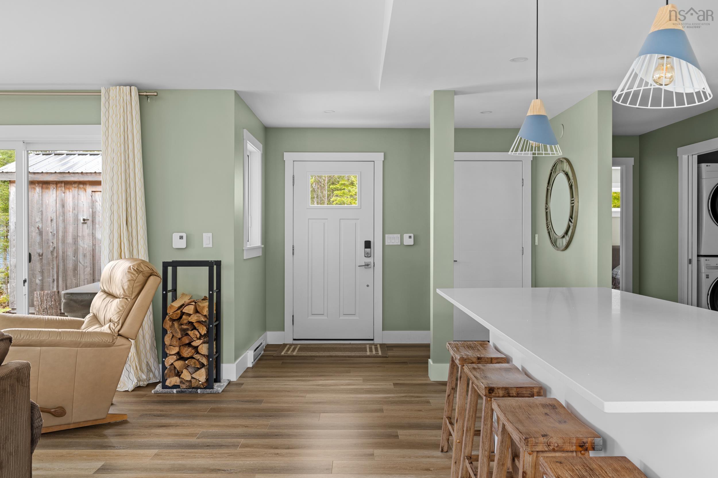 Indulge in effortless, one-level living in this beautifully designed 2-bedroom, 4-piece bath bungalow, perfectly situated to capture breathtaking panoramic lake views. Only three years old, this home exudes modern elegance with an open-concept layout that seamlessly blends the spacious living room, dining area, and a chef-inspired kitchen—ideal for entertaining and everyday living. Indulge in the sleek contemporary wood stove, offering both warmth and ambiance, and creating a cozy atmosphere perfect for relaxing after a day by the lake. Wake up to panoramic lake views from your front windows, and end your day with sunsets that feel like they were painted just for you, and you may even get a glimpse of the Northern Lights! The covered front porch invites quiet mornings with coffee, while the very private backyard offers a peaceful escape surrounded by mature, lush landscaping, and the paved driveway ensures convenience and curb appeal. Outdoors, enjoy multiple lake access points ideal for swimming and kayaking, shared docks, a convenient boat ramp, and an impressive walking trail system that winds through nature. Whether it’s spotting graceful birds, playful rabbits, the wildlife becomes part of your everyday backdrop. Additional features include a dedicated storage shed and quality finishes throughout, making this the perfect retreat for those who appreciate style, comfort, and the serenity of lakeside living.