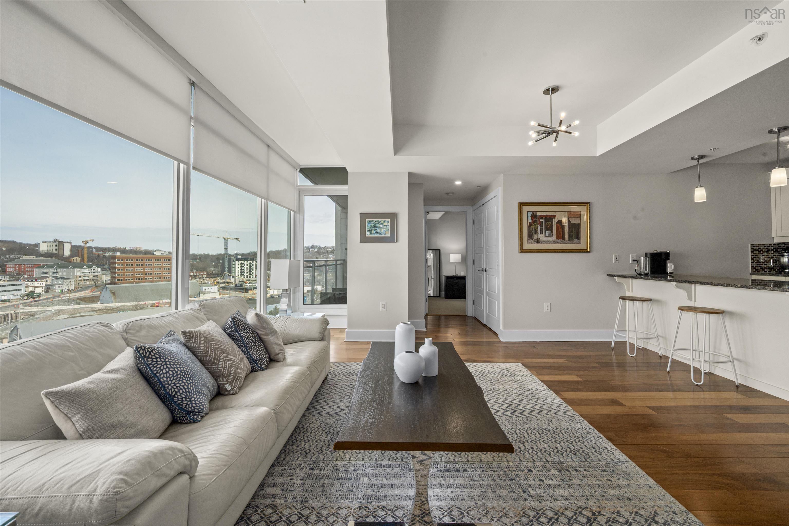 Welcome to Unit 806 in the Keelson at Kings Wharf! This bright and spacious two bedroom, two bathroom condo offers 1000 square feet of comfortable living in one of Dartmouth’s most desirable waterfront communities. The location is ideal with restaurants, cafés, the marina, and the waterfront trail system all just a short walk away. Inside, the open concept living area is filled with natural light from floor to ceiling windows, creating an inviting space for relaxing or entertaining. The kitchen features shaker style cabinetry, stainless steel appliances, and granite countertops, while the living and dining area is enhanced by a natural gas fireplace and elegant tray ceiling. Step out to the balcony where you can enjoy partial water views and a peaceful place to unwind. The spacious primary bedroom includes a full ensuite, while the opposite side of the unit offers a second bedroom and full bathroom with walk-in shower. Condo fees include heat, air conditioning, hot and cold water, and exterior maintenance. The unit also includes an assigned underground parking space, storage, and access to the building gym. A fantastic opportunity to own a beautiful condo in a sought after waterfront community, attractively priced at $549,900!