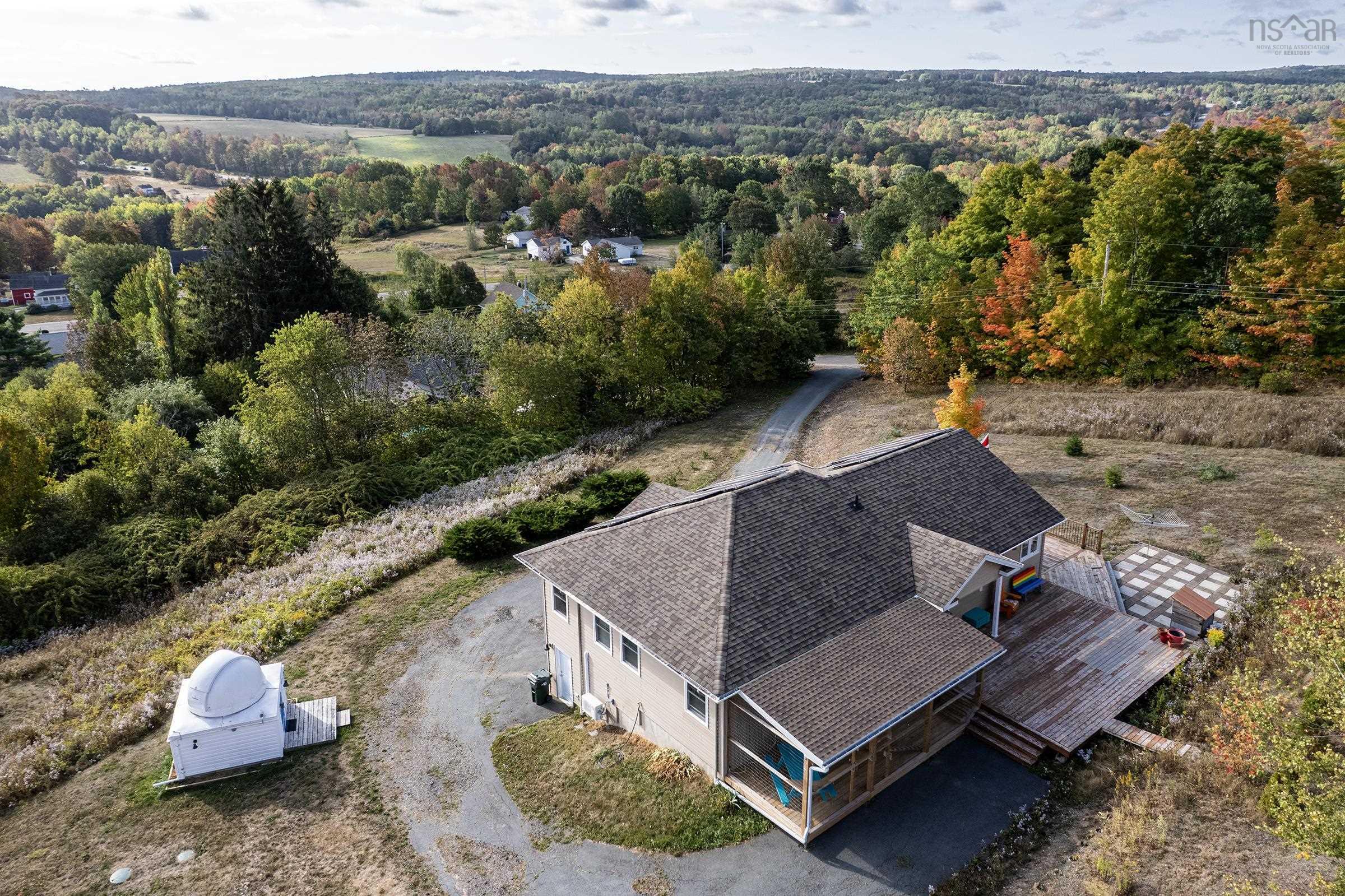 This well-maintained, 18-year-old home sits on 1.83 acres of elevated land, perched on a hilltop with scenic views overlooking the rolling hills of the Annapolis Valley - a backdrop that changes beautifully with the seasons and provides an ideal setting for bird and wildlife watching. Despite the peaceful, private feel, you're only minutes from Kentville's full range of amenities and quick Highway 101 access, making this a rare combination of rural atmosphere and everyday convenience. At approximately 2,800 sq ft, the bright, open layout offers excellent flow across two levels, with 4 bedrooms, 3 bathrooms including an ensuite off the primary bedroom, and two family rooms - one up, one down. Inside, you'll find hardwood floors, fresh paint throughout, renovated bathrooms, and a modern kitchen with ample storage. Attached and detached garages offer generous parking and additional storage. The outdoor living space is equally well-considered - a large deck takes full advantage of the views, while a separate patio is set up perfectly for a raised firepit. A small fenced area works well as a garden plot or pet enclosure. The 1.8 acres includes newly planted trees and perennials along with an established selection of fruit and berry plantings - raspberries, blueberries, hascaps, currants, strawberries and nut trees. Practical infrastructure is solid throughout: 200A electrical service, generator wiring, solar panels with time-of-use savings potential, and flexible heating via heat pump, propane stove, radiant infloor and electric baseboard. Appliances included. A move-in ready family home offering space, views, and long-term value.