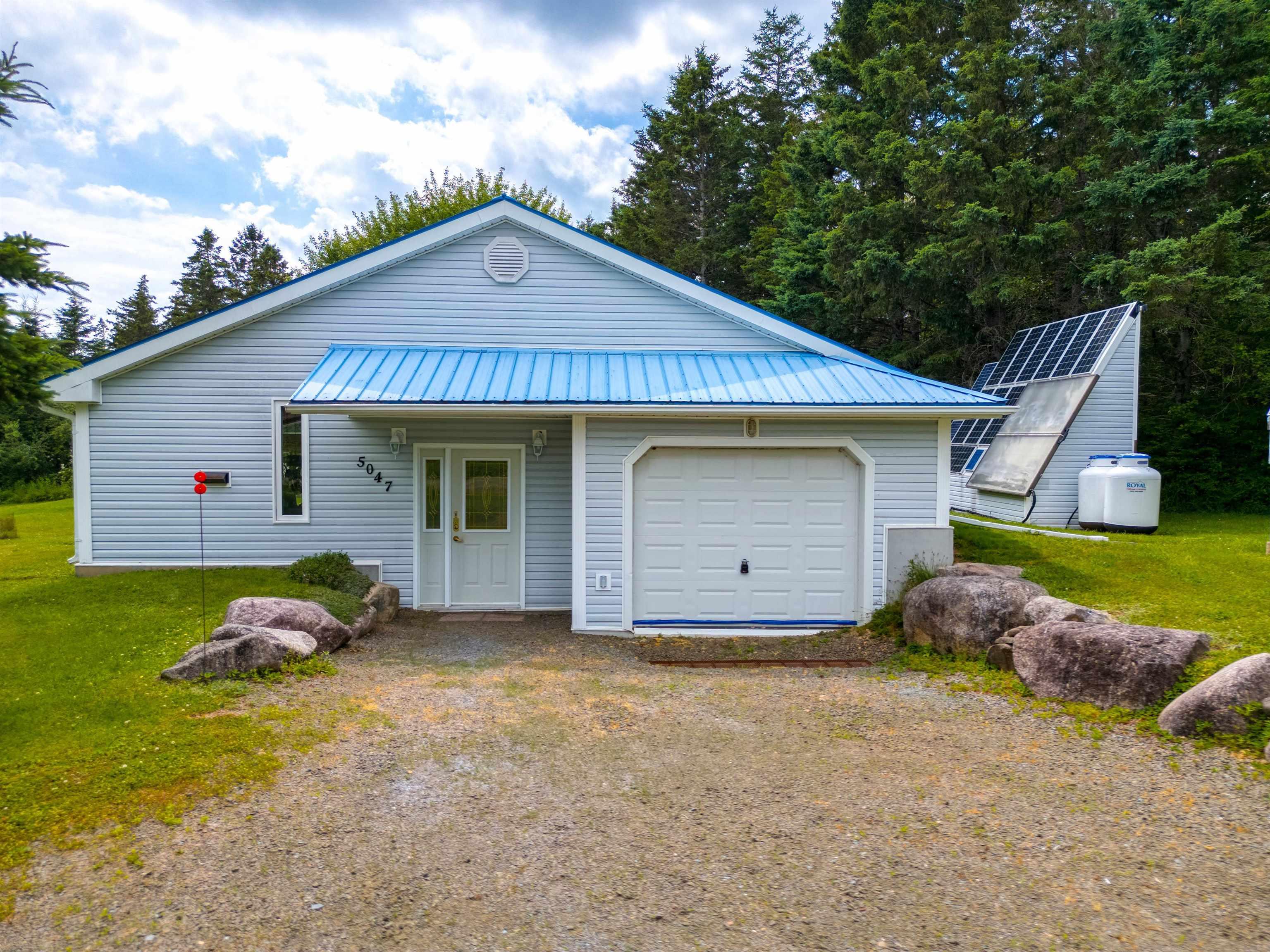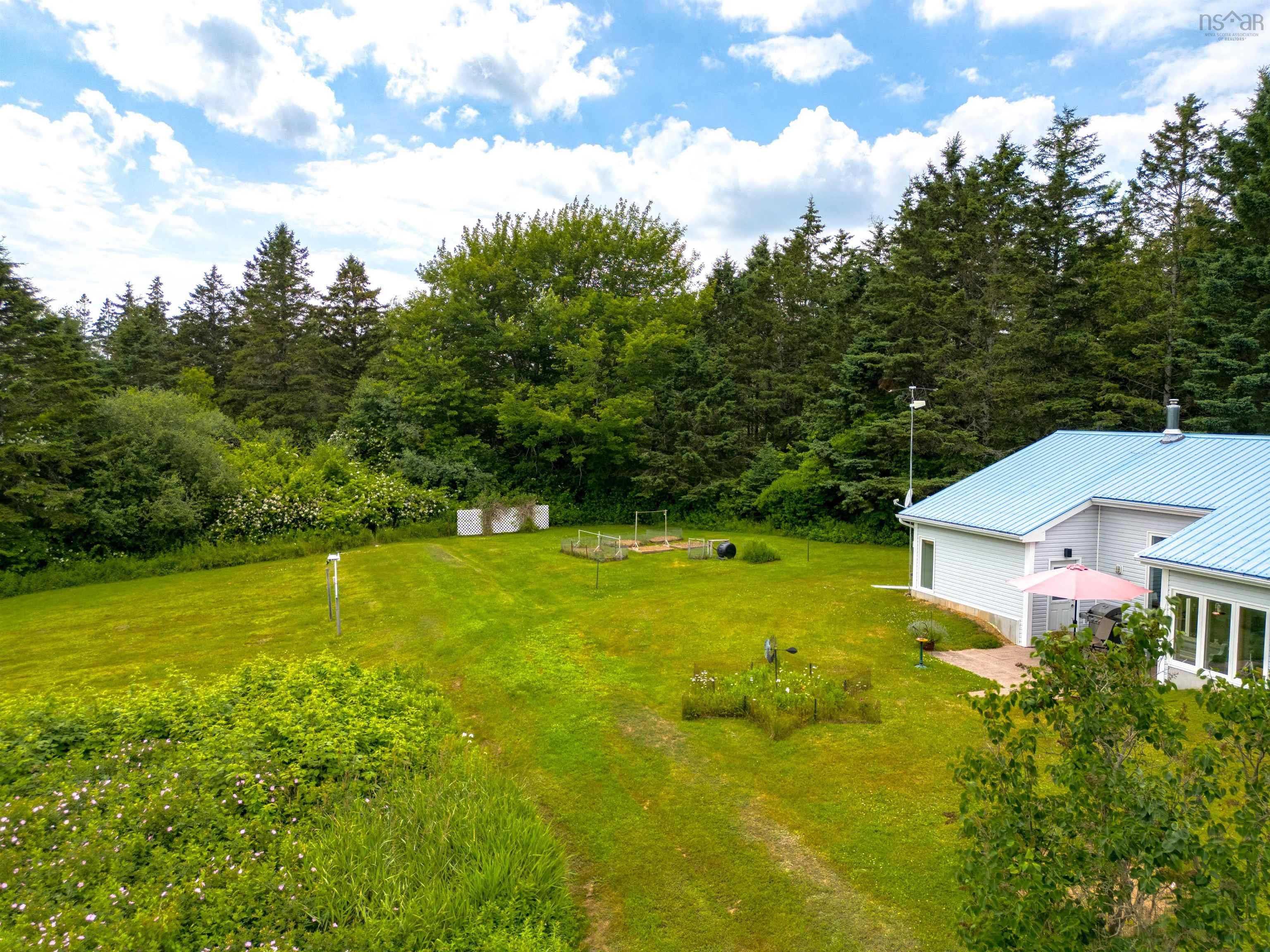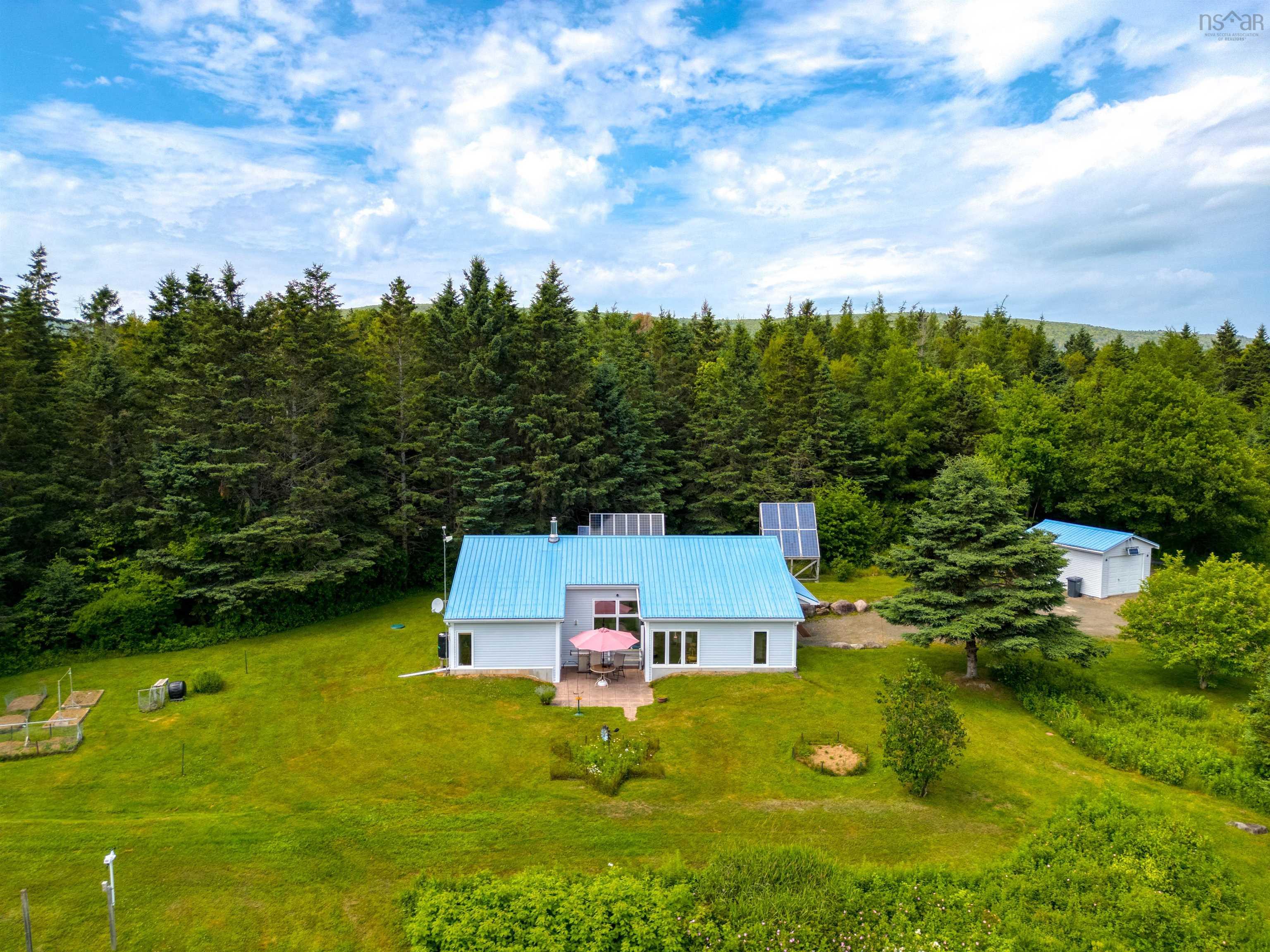 Off-Grid Passive & Active Solar Home – 18.95 Acres Near Annapolis Royal Designed by solar architect Don Roscoe and P.P. Griggs, P.Eng., and built in 2002 by Larry Budd of Digby, this off-grid home offers sustainable living with comfort and privacy. The property features 990 sq. ft. of living space plus 442 sq. ft. of storage and a 295 sq. ft. loft. Inside are two bedrooms, a full bath, and a laundry room, with an open-concept kitchen, dining, and living area under soaring 12-foot ceilings. Ceramic tile floors and knotty pine finishes add warmth, while a steel roof, vinyl siding, drilled well, and septic make for low-maintenance living. The home is designed for and active solar performance. South-facing low “E” glass windows and a bermed north side optimize natural heating and cooling throughout the year. Photovoltaic and glycol solar panels supply most of the property’s electricity and hot water, supported by a back-up generator and on-demand propane hot water heater. A thermal circulation system directs solar heat into the concrete floor, reducing costs and maintaining comfort. The result is exceptionally low operating expenses and protection from rising utility rates. Set on 18.95 acres with two acres of open field and nearly 17 acres of woodland, the property offers privacy and natural beauty. Two outbuildings include a solar and battery building plus an equipment building large enough for a small car. The grounds feature five raised-bed gardens, four flower beds, and a 16’ x 13’ concrete patio. Hidden from the road and perched 70 feet above high water level with a partial view of the Annapolis River, the home is only 10 minutes from Annapolis Royal, combining seclusion with convenience.