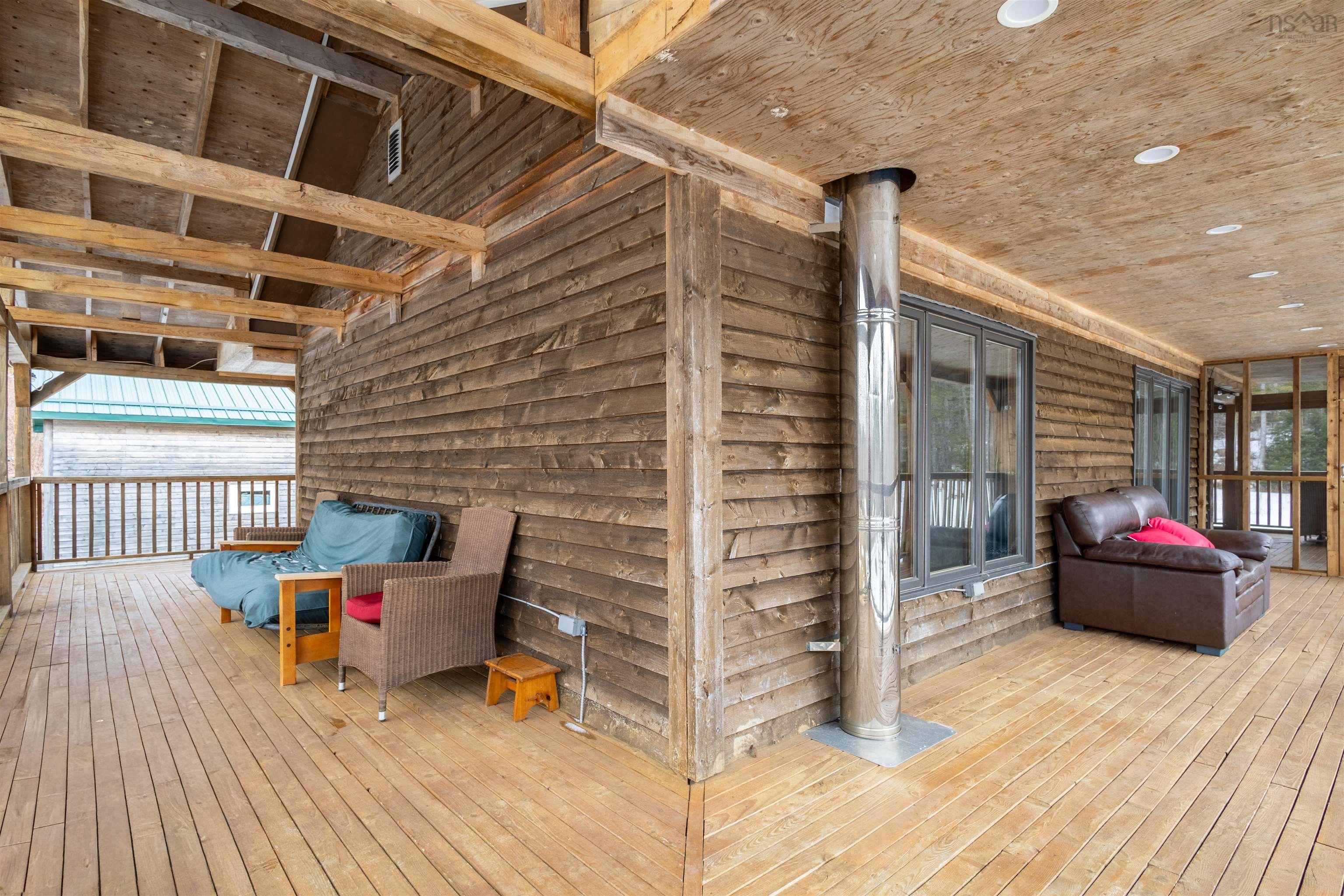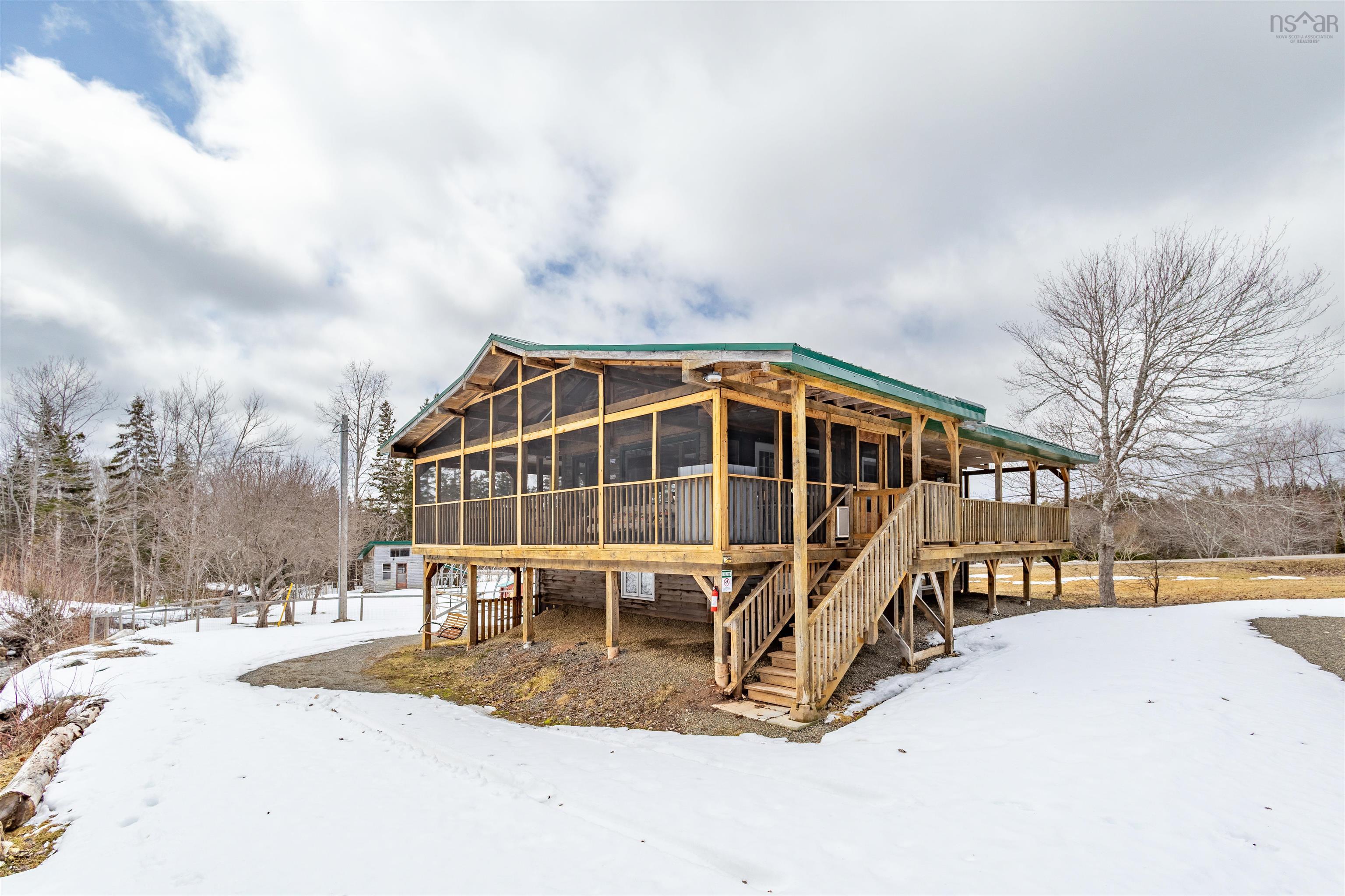 Set on 10.9 acres of useable land just 10 minutes from the village of Baddeck, this unique Big Harbour property offers the perfect blend of privacy, functionality, and natural beauty. This two-bedroom, two-bath home offers the perfect balance of rural living, hobby farm potential, and everyday comfort. The main level features a bright open-concept kitchen, dining, and living space, along with a spacious primary bedroom and full four-piece bath. The lower level adds flexibility with a rec room or mudroom area, second bedroom (egress tbc), full bath with laundry, and direct walkout access. The home is efficiently heated with a heat pump, supported by a wood stove for added warmth and comfort. Outdoor living is where this property truly shines—enjoy a full wraparound covered patio, with the front section completely screened in, creating a peaceful space to take in the sights and sounds of the brook and waterfall flowing just steps from the home. The land is well suited for gardening, hobby farming, or small-scale homesteading, featuring a greenhouse, chicken coop, and many areas of high sun exposure land. Especially loved by the current owners, across the brook—ideal for growing and simply a beautiful place to enjoy the views. Additional acreage extends to the back of the property with its own access road, offering potential for further development or subdivision. Footbridges cross the brook, and two wells provide water options, including one for irrigation. A double detached garage with concrete floor adds valuable storage or workshop space. Located on a quiet road with nearby public water access at the old municipal dock, this property offers privacy, natural beauty, and convenience in one complete package.