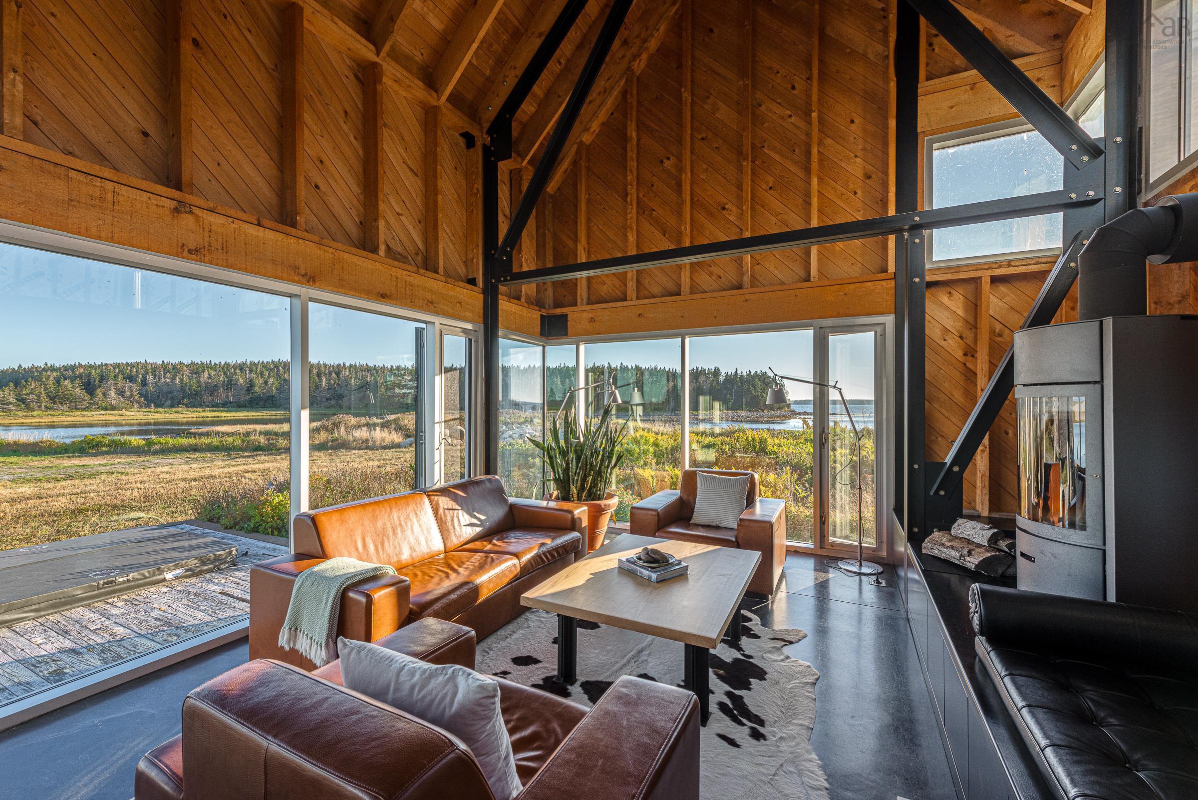 Point House, a rare offering by internationally acclaimed architect Brian MacKay-Lyons, occupies a coveted peninsula within AIA National Honour Award winning Shobac Farm - an enclave where design excellence, natural splendour and a history of place converge. Surrounded by Atlantic waters on three sides, Point House transcends conventional coastal living through its marriage of Nova Scotian vernacular and contemporary minimalism. Eastern White Cedar shingles and steep gabled rooflines honour Nova Scotia's architectural heritage while floor-to-ceiling glass walls dissolve boundaries between interior and exterior spaces. The double-height great room is punctuated by blackened steel totemic elements and anchored by a monumental hearth and a STUV high-efficiency wood stove while the gourmet galley kitchen features Wolf appliances and custom millwork. A sculptural steel ribbon staircase - equal parts function and art - ascends to the loft retreat, a private sanctuary suspended above. The two-story companion bunkie - with transformative pivoting walls - seamlessly merges interior comfort with the tranquility of the exterior tidal pond. An infinity hot tub at the water's edge completes this coastal sanctuary, where sunrise and sunset paint daily masterpieces across the sky. Steps from Hirtle's Beach and Gaff Point trails, this award-winning property offers unparalleled natural beauty. Exceptional opportunity for year-round living, luxury retreat, or income-generating investment in one of Atlantic Canada's most architecturally significant communities.